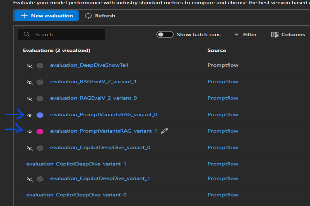 10. Check the results by clicking on the evaluation. You can compare the two variants of prompts by comparing their metrics to see which prompt variant is performing better.