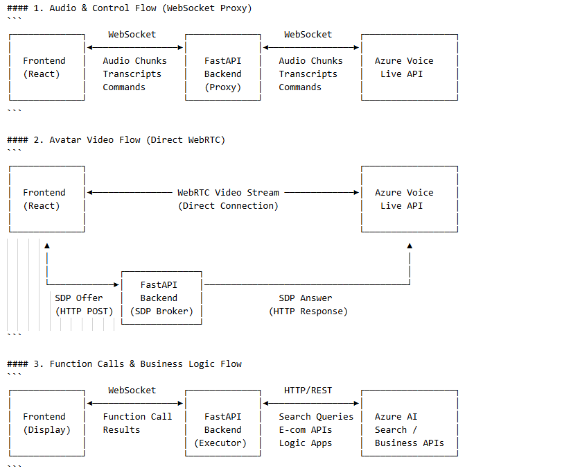 The solution implements a hybrid architecture that leverages both WebSocket proxying and direct WebRTC connections for optimal performance. This design ensures the conversational audio flow remains manageable and secure through the backend, while the bandwidth-intensive avatar video streams directly to the browser for optimal performance.