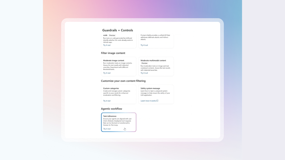 - Try Task Adherence with the Azure AI Content Safety API (coming soon to Public Preview)
