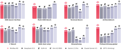 Figure 1. The MiniMax-M2's abilities are very close to similar, top performing models like DeepSeek-V3.3, GLM-4.6, and Gemini 2.5 Pro.The graphic above compares MiniMax-M2’s performance across multiple industry-standard benchmarks against leading models like DeepSeek-V3.2, GLM-4.6, and Gemini 2.5 Pro. While proprietary models such as GPT-5 (thinking) and Claude Sonnet 4.5 remain strong in certain areas, MiniMax-M2 delivers competitive results as an open-source solution, offering enterprise-grade performance for organizations seeking high-quality AI without compromising scalability or flexibility.