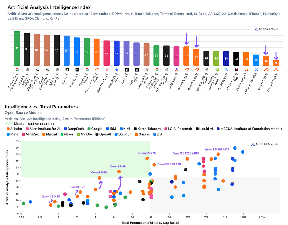 - High intelligence density at small sizes: Qwen 3.5 Small models show large reasoning gains relative to parameter count, with the 4B and 9B variants outperforming other sub‑10B models on public reasoning benchmarks.