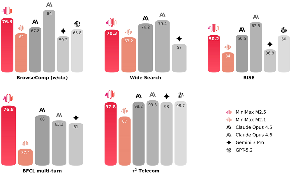 - Expert-level search and tool use: M2.5 achieves industry-leading performance in BrowseComp, Wide Search, and Real-world Intelligent Search Evaluation (RISE), laying a solid foundation for autonomously handling complex tasks.