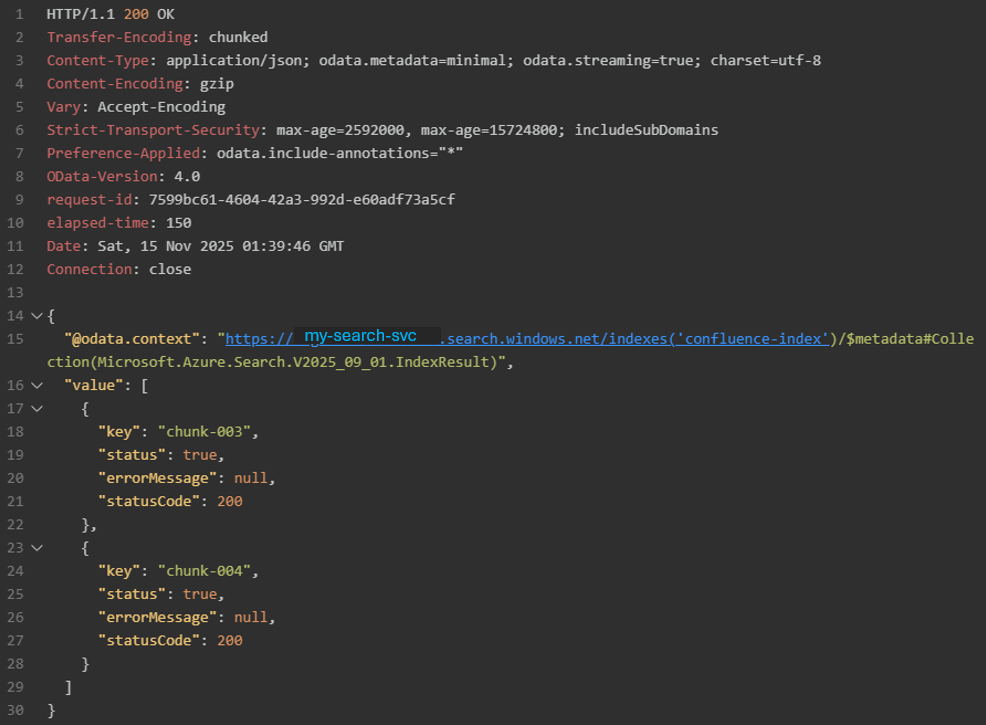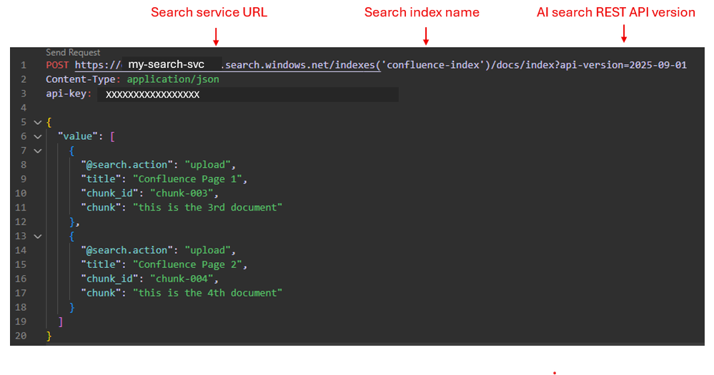 Below is a POST command example. When pushing data to the index, you need to specify the field names. This code shows how to insert two new chunks with document key ‘chunk_id’ with values ‘chunk-003’ and ‘chunk-004’.
