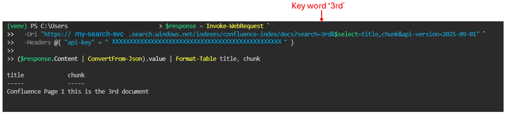 Since the new documents were inserted as chunks, you can search by using keywords. Below is a CURL command in PowerShell.