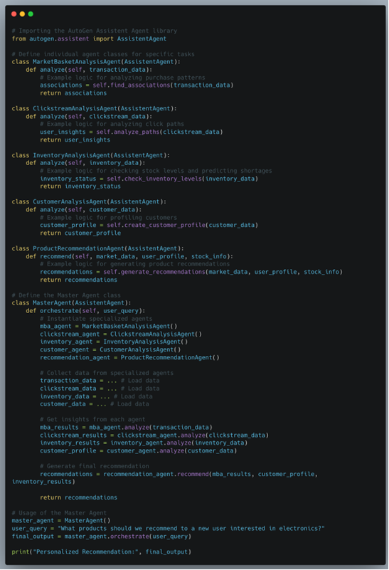 Below is an illustrative Python code snippet demonstrating how these agents could be coordinated using AutoGen:
