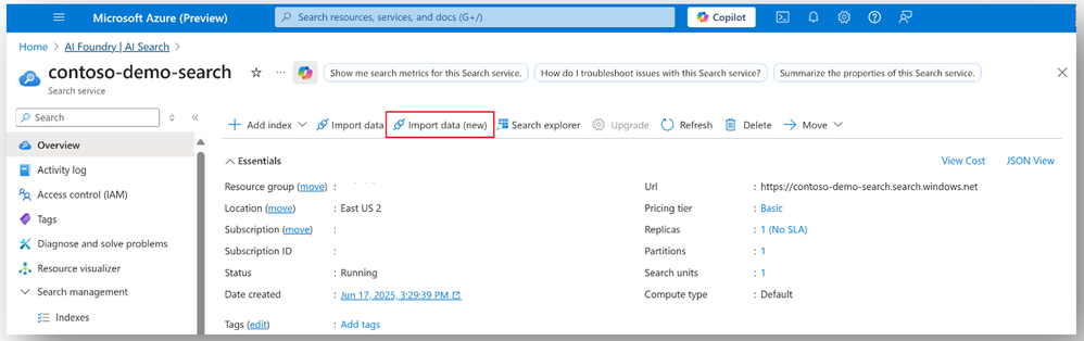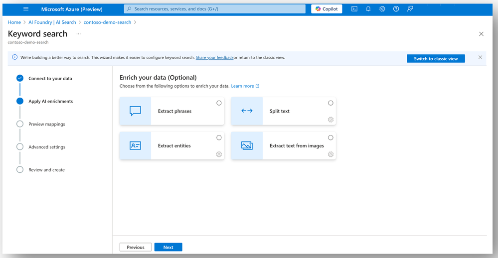 By consolidating workflows and integrating modern AI capabilities, the Import Data (new) wizard surfaces the most used AI Search features while minimizing complexity. With support for vectorized search, multimodal capabilities, and semantic ranking, the new wizard enables you to build smarter, faster, and more accurate search solutions.