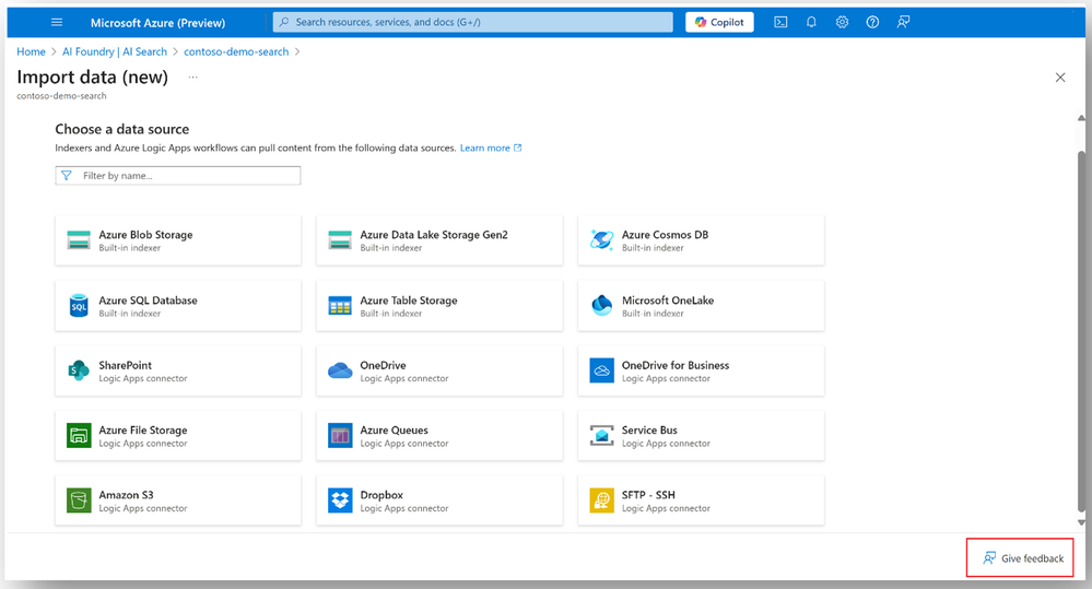 We encourage you to explore the Import Data (new) wizard and experience the enhanced capabilities firsthand. Whether you’re a seasoned developer or new to Azure AI Search, this streamlined workflow makes it easier than ever to build powerful search solutions. Also, if you have any feedback, please let us know via the link at the bottom of the wizard.