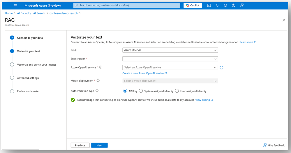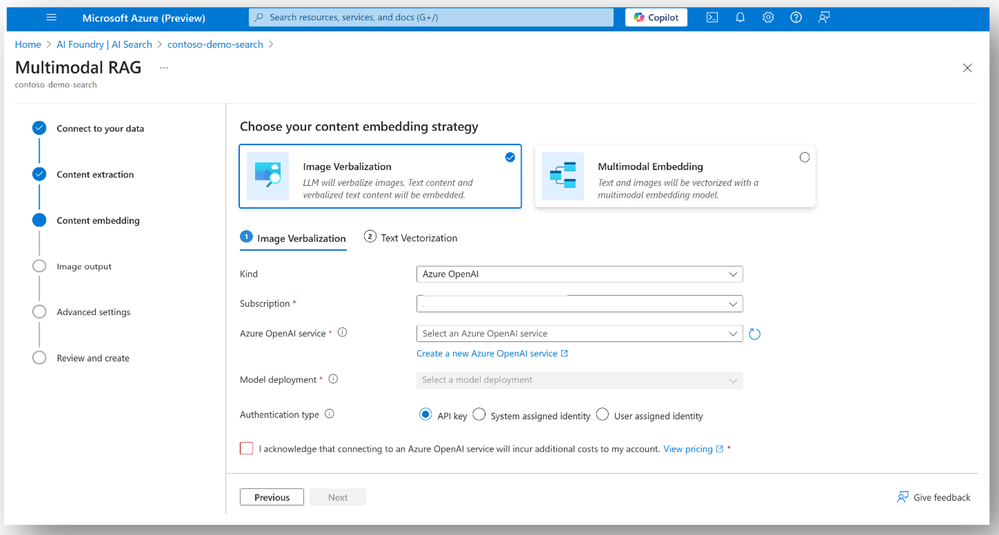 - Enhanced Capabilities: The new wizard supports keyword search, RAG, and multimodal RAG while connecting seamlessly to embedding model deployments for vector generation and to chat completion models for image verbalization.