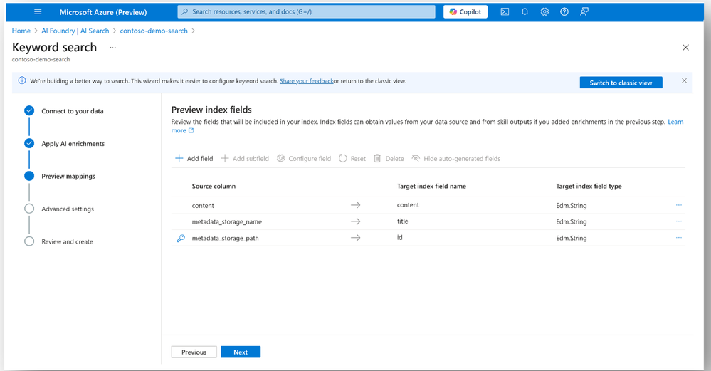 Search technology continues to evolve, and Azure AI Search is committed to delivering updates that simplify workflows and enhance developer productivity. In response to customer feedback and real-world scenarios, we’re excited to announce an updated Azure AI Search "Import Data" wizard experience in the Azure portal. This update is designed to enhance the user experience, enabling developers to create indexes more efficiently using an improved low-code interface, making it easier to integrate search functionality into applications.
