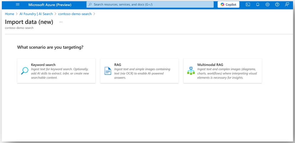 Recently, Azure AI Search rolled out the "Import Data (new)" wizard, an enhanced experience that merges the capabilities of the older "Import Data" wizard for keyword search with the integrated vectorization wizard previously used for RAG and multimodal RAG workflows.
