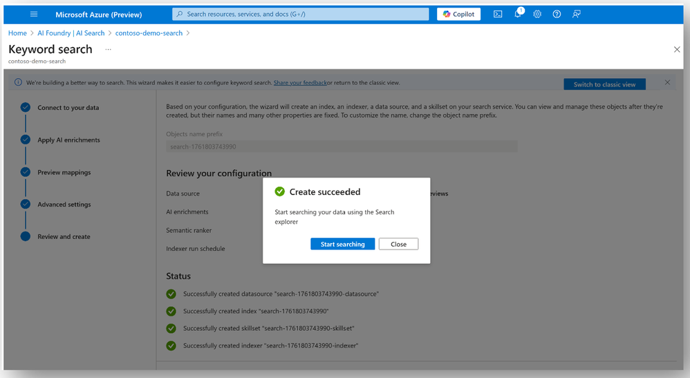 This update offers a more intuitive and modernized process for creating indexes, configuring skillsets, and connecting to data sources, ensuring that you can take advantage of the latest features available in Azure AI Search for applied AI, vectorization, and multimodal search with ease so you can have indexes ready to plug to your application code/orchestrator as needed.
