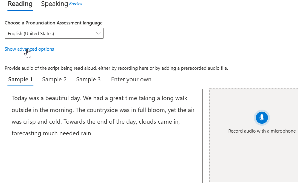In November Ignite 2023, we are taking Pronunciation Assessment to the next level with new public preview features in English that cover Prosody, Grammar, Vocabulary and Topic. These new features will provide an even more comprehensive language learning experience for learners and educators, including speaking and conversational-based evaluation without a script. For Reading scenario, we are releasing new features in the Reading Progress in Teams as shown on Figure 1. Pronunciation assessment on reading accuracy and prosody for students can be used inside and outside of the classroom to save teachers time and improve learning outcomes for students on reading accuracy and prosody aspects. For Speaking scenario, Pronunciation assessment is also used in PowerPoint coach to advise presenters on the correct pronunciation of spoken words throughout their rehearsal. With its advanced capabilities, Pronunciation Assessment is ultimate for anyone looking to take their language learning to the next level.
