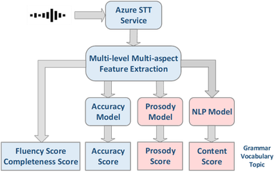 The high-level architecture of our pronunciation assessment system is shown in Figure 2. The enhanced system can provide up to seven scores based on the scenario. These scores are accuracy, fluency, completeness as well as four new scores which are prosody, grammar, vocabulary, and topic.