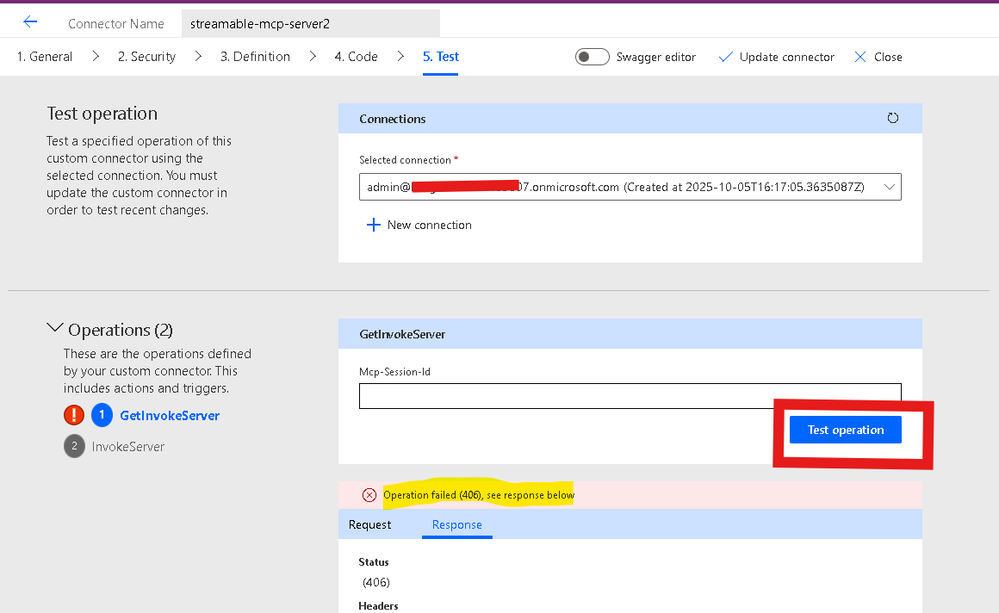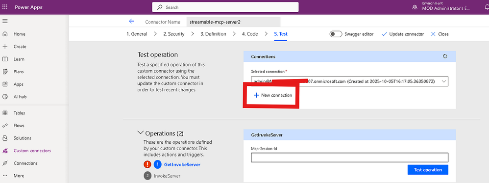 1. Lauch the http://make.powerapps.com and click on “Custom connectors”, select your configured connector and click “5. Test” tab as shown below. You will see Selected Connection as blank if you are running it first time. Click “+ New connection