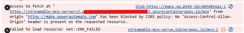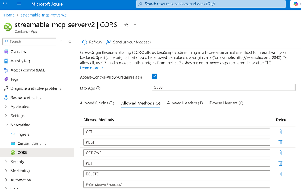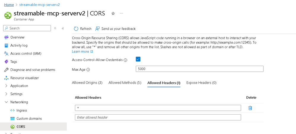 CORS configuration is a MUST!!! Since our Azure Container App is a remote MCP with totally different domain or origin.