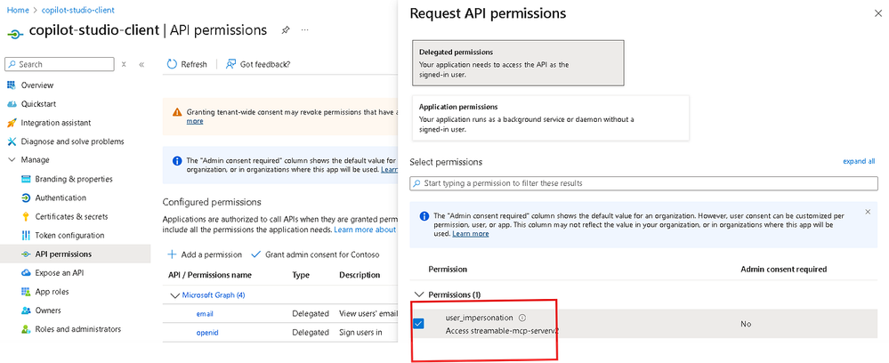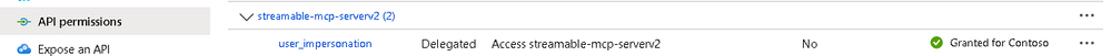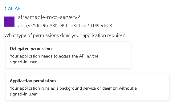 1. Configure API permissions for backend which is App registration of Azure container app i.e. streamable-mcp-server2 in this case. Click “API permissions” tab. Click “Add a permission”. Click on “My APIs” tab as shown below and select streamable-mcp-server2.