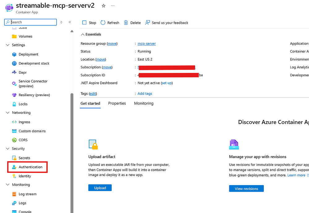 1. Lauch Azure Portal. Visit Azure container app i.e. streamable-mcp-server2 in this case.
