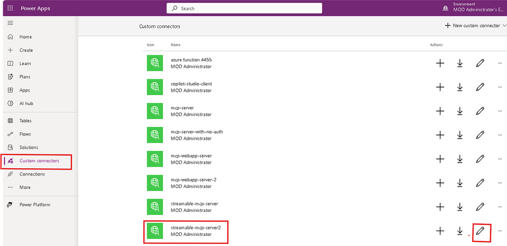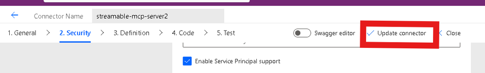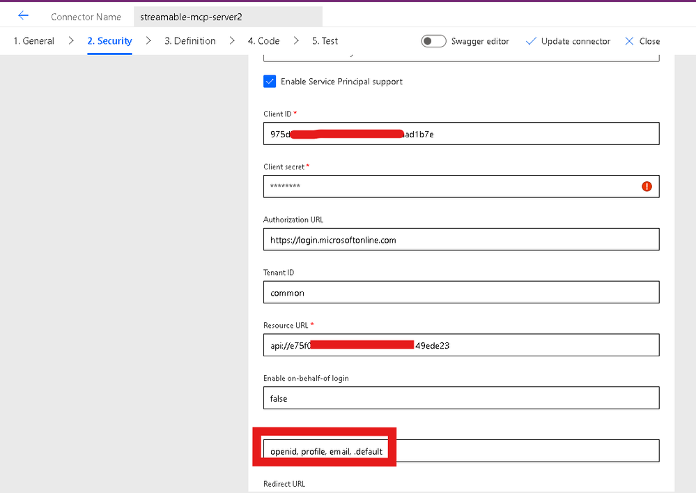 Change the Resource URL from “Expose an API” in streamable-mcp-server2 app registration. The backend “Application ID URI” and also add .default in the scope. Provide the secret of client app registration as it will not let you update the connector. This is extra security measure for updating the connector in Powerapps.