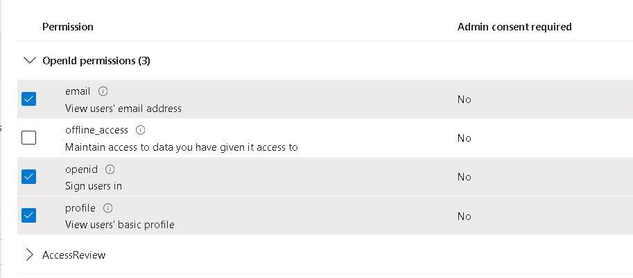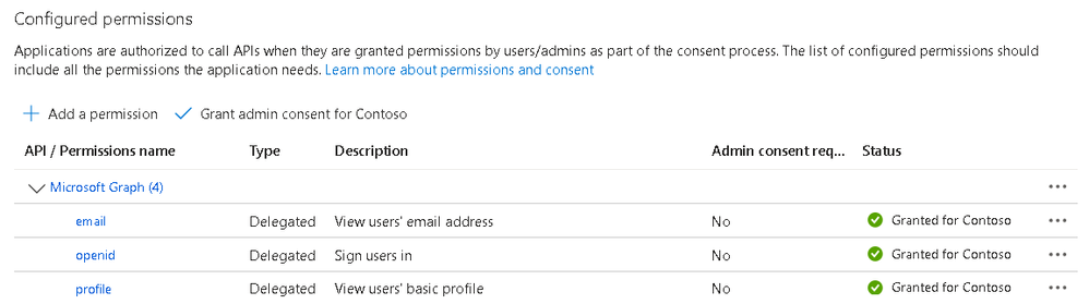 1. Click on API permission and click “Add a permission”. Click Microsoft Graph and then click “Delegated permissions”. Select email, openid, profile as shown below.
