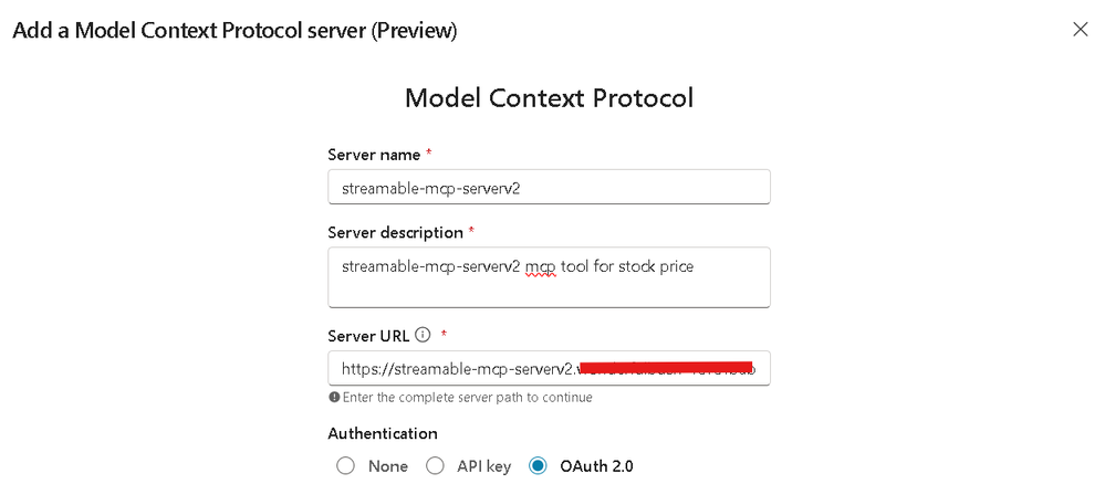 1. Provide all relevant information for MCP server. Make sure your server URL ends with your mcp setup. In this case, it is Azure container app URL with/mcpin the end. Provide server name and server description.