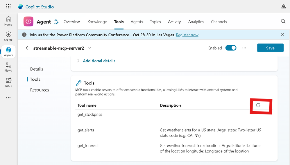 Lauch copilot studio and click on the Agent you created in earlier steps and click on “Tools tab”. Select your MCP tool as shown the following figure.