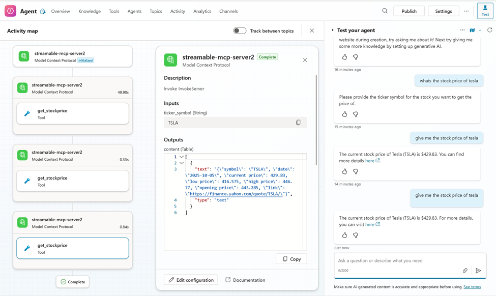 Provide the prompt such as “Give me the stock price of tesla”. This will trigger the MCP server and call the respective method to bring the stock price of Tesla.