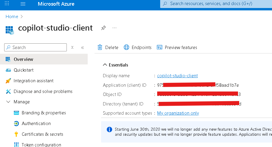 In these steps, we will be configuring app registration for the client app, such copilot studio in this case acting as a client app. This is also mentioned in the “high level architecture” diagram in the earlier section of this article.