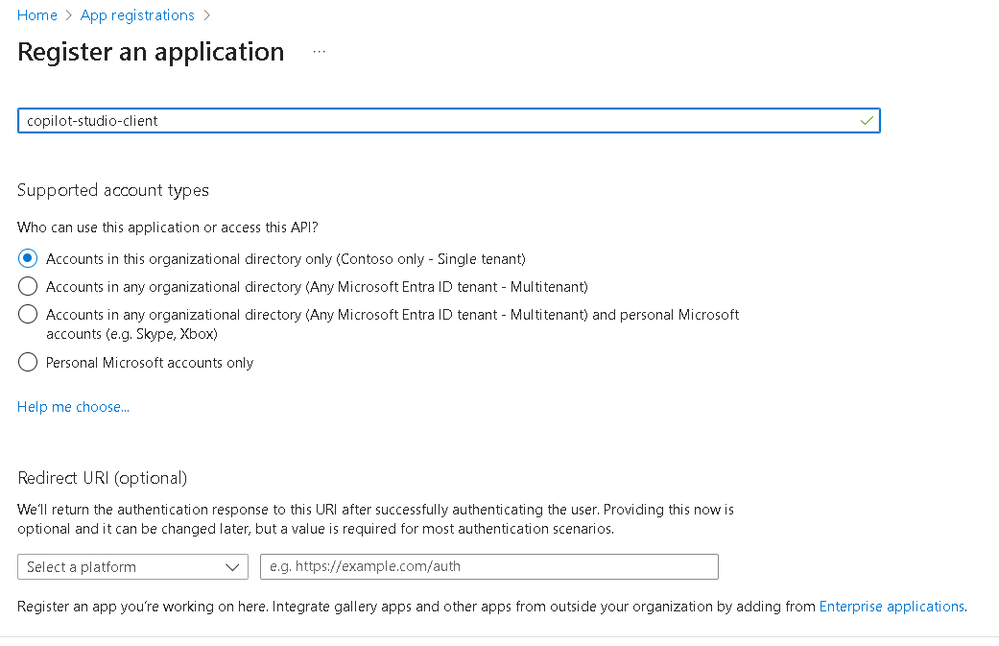 1. Create a new App registration. leave the Redirect URL as of now, we will configure it later as it is provided by copilot studio when configuring custom MCP connector.