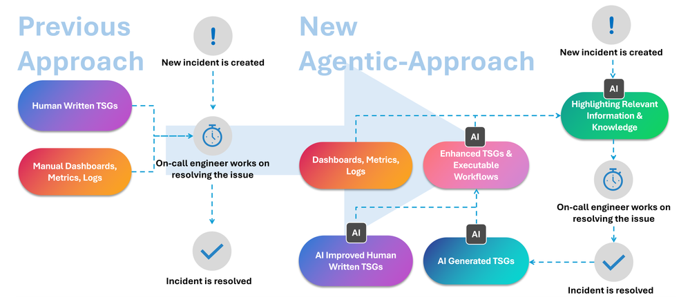 Lately, with the rise of generative AI apps and agents, we have started to develop new solutions to help improve the quality of these TSGs and help on-call engineers find and execute the required steps faster and more efficiently. Theoretically, the entire flow from improving the existing TSGs to help DRIs take more decisive and quick action, all the way to having AI agents executing actions (such as running queries against logs and analyzing the outputs) can be automated with agents!