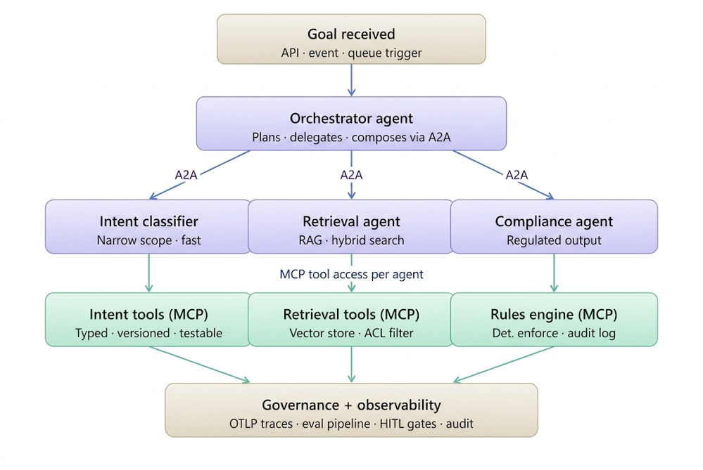 MCP is the tool interface standard today. An MCP server exposes a typed manifest any compliant agent runtime can discover at startup. Tools are versioned, independently deployable, and reusable across agents without bespoke integration code. A2A extends this horizontally: agents advertise capability cards, discover peers, and delegate subtasks through a standardised protocol. The practical consequence is that multi-agent systems built on both protocols can be composed and governed as a platform rather than managed as a collection of one-off integrations.