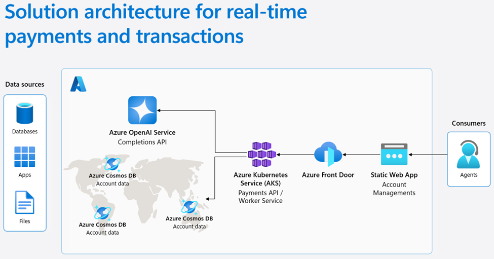 Here is an architecture example for a real-time payments and transactions application leveraging Azure OpenAI Service, Azure Cosmos DB, AKS, Azure Functions, and Azure Event Hubs: