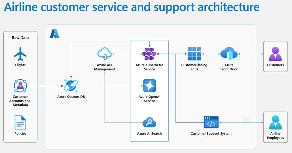This intelligent application has two interfaces – a customer-facing online support portal and an internal Customer Support System application. Azure Front Door provides a single-entry point (contoso.com) for multi-region architecture. Raw data from flight booking systems, luggage tracking, customer account data, and travel policies are stored in Azure Cosmos DB. AKS hosts the web UI and integrates other components of the solution. The application uses RAG, with Azure AI Search as the retrieval system and Azure OpenAI Service providing Large Language Model (LLM) capabilities, allowing customer service reps and customers to ask questions using natural language.