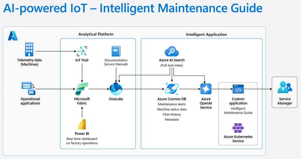 This example shows an IoT platform in Azure that helps with manufacturing data analysis, and service and maintenance issues. The Intelligent Maintenance Guide uses generative AI and chat features for real-time alerts and guidance on how to resolve maintenance issues. The application runs on AKS and uses Azure Cosmos DB for machine-specific status and alert data, as well as chat history. Azure AI Search acts as the search and retrieval system, surfacing relevant data to Azure OpenAI Service.