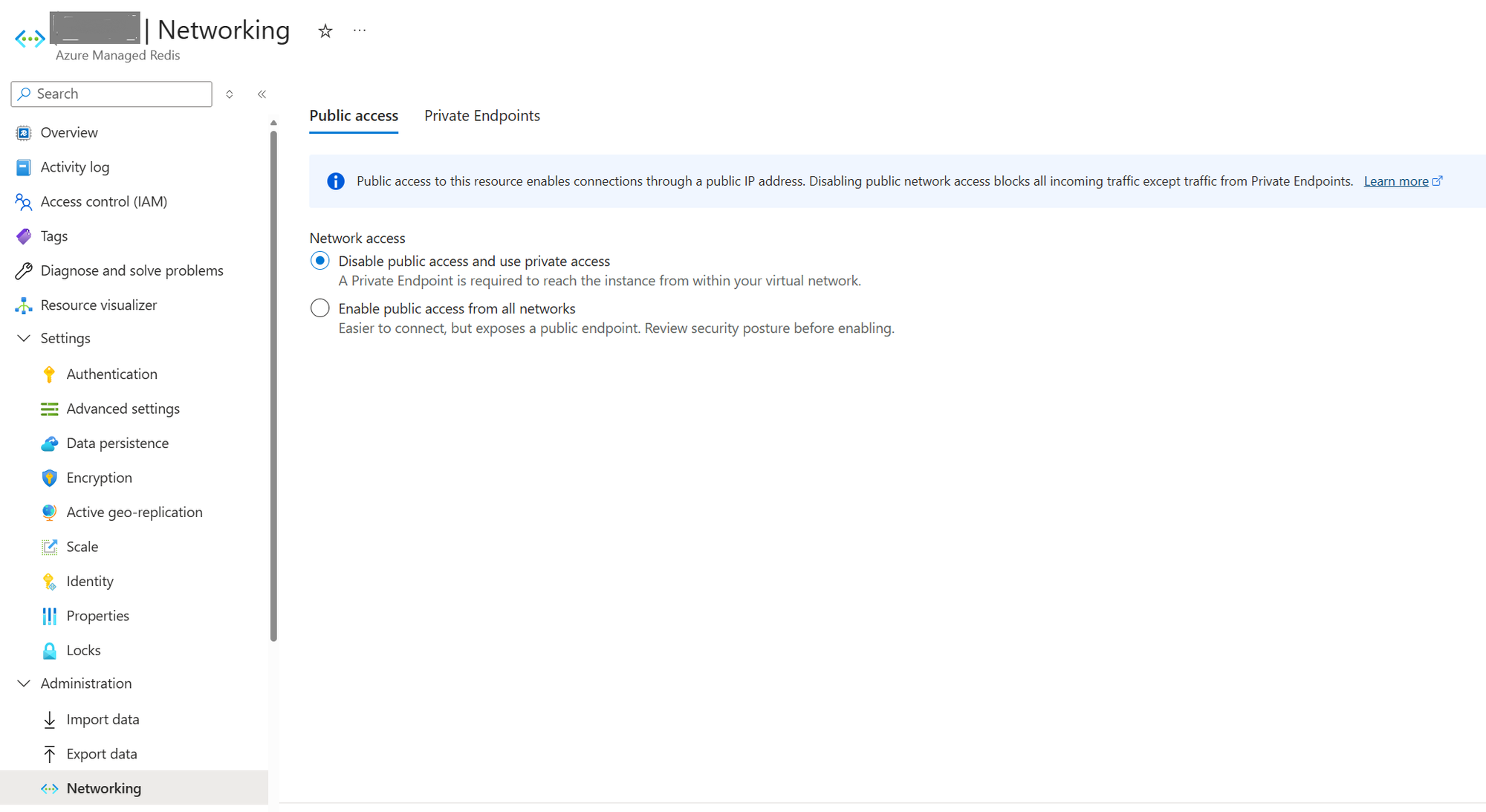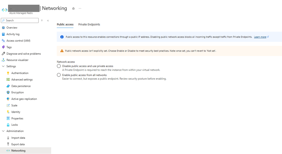 Figure 1: Set PublicNetworkAccess in existing Azure Managed Redis by selecting ‘Disable’ or ‘Enable’ public access