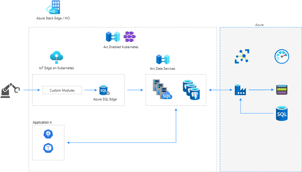 Azure Arc-enabled data services on Kubernetes: is the foundation for the factory and acts as the central point of data aggregation and persistence. It can be configured to host multiple numbers of either Azure SQL Managed Instances or PostgreSQL Hyperscale. These instances can be scaled up or down dynamically, configured to be high available, always current with the regular updates and monitored centrally in the Azure cloud.