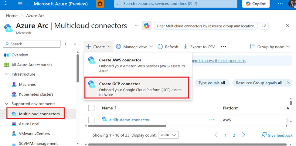 We are excited to announce that the Multicloud connector is now in preview for GCP environments. With the Multicloud connector, you can easily connect your GCP projects and AWS accounts to Azure with the following capabilities: