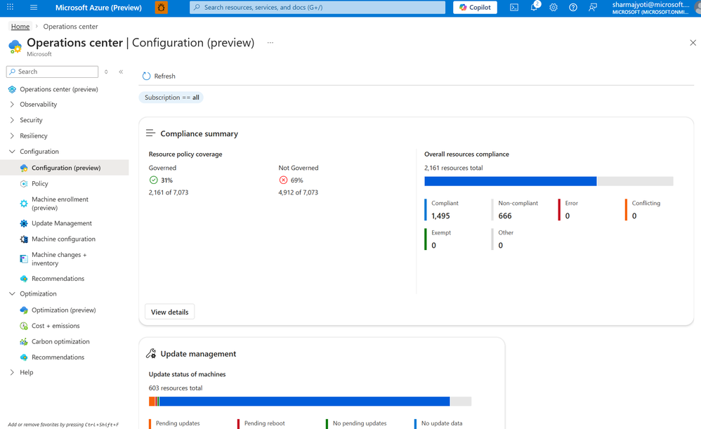 We are introducing new configuration management capabilities in the operations center within the Azure Portal, enabling a unified approach to managing servers and VMs and improving operations across cloud and on-premises environments at scale. In the configuration blade of the operations center dashboard, you can get a unified view of core capabilities needed to manage servers at scale. It spans Windows and Linux servers running in Azure or connected through Azure Arc, unifying their management under a centralized interface for searching resources, managing inventory, enforcing governance and organizational standards, handling updates, patching, and recommendations to streamline operations. With real-time insights including system health, performance monitoring, patch compliance, and back-up status across the cloud and on-premises environments, day-to-day management becomes more efficient.