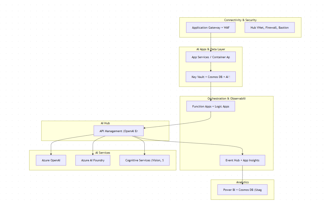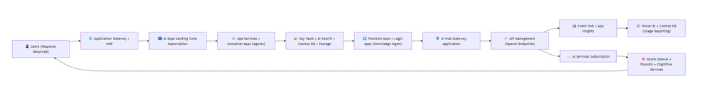User โ†’ App Gateway (WAF) โ†’ App in AI Apps Landing Zone โ†’ Call to Azure OpenAI / AI Services โ†’ (Optional: Knowledge retrieval) โ†’ AI Response โ†’Returned to User โ†’ Usage logged & monitored โ†’ Usage reporting in AI Hub