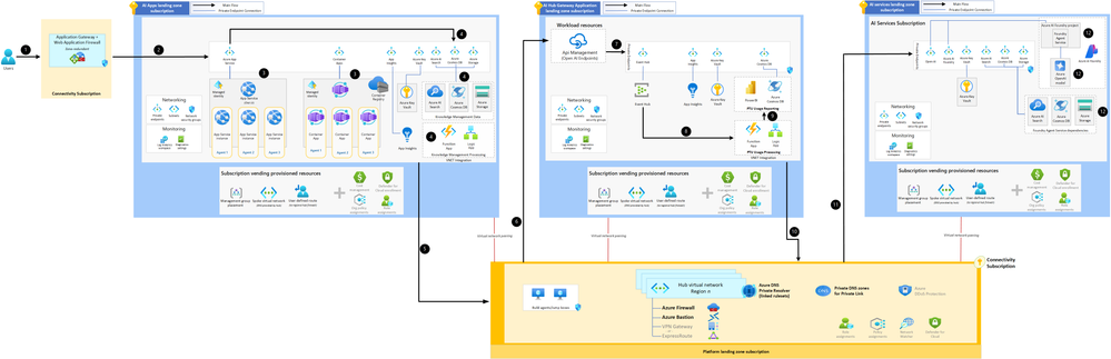 • The Application Gateway securely routes the request to the AI Apps Landing Zone Subscription.