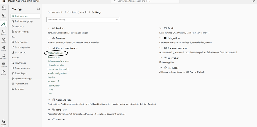 - Go to Environments > [Your Environment] > Settings > Users + permissions > Application users.