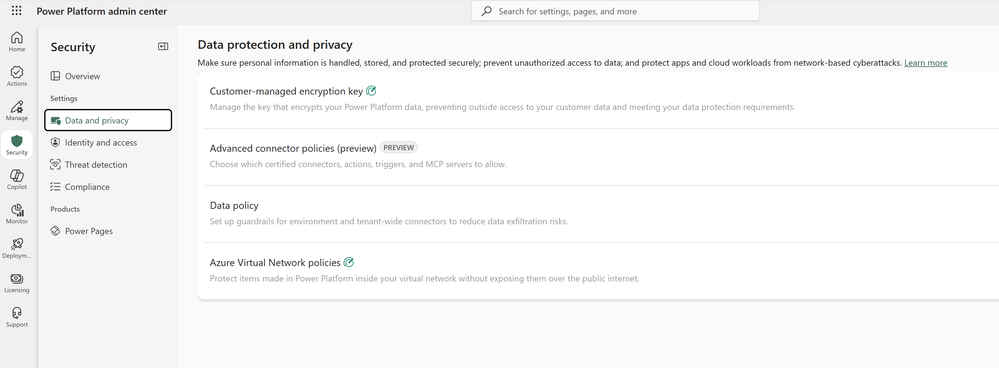 - For VNet Injection: In the Admin Center, go to Security > Data and privacy > Azure Virtual Network Policies. Select your environment and link it to the Network Injection policies you created.