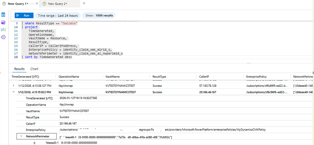 AzureDiagnostics | where ResourceProvider == "MICROSOFT.KEYVAULT" | where OperationName == "KeyGet" or OperationName == "KeyUnwrap" | where ResultType == "Success" | project TimeGenerated, OperationName, VaultName = Resource, ResultType, CallerIP = CallerIPAddress, EnterprisePolicy = identity_claim_xms_mirid_s, NetworkPerimeter = identity_claim_xms_az_nwperimid_s | sort by TimeGenerated desc