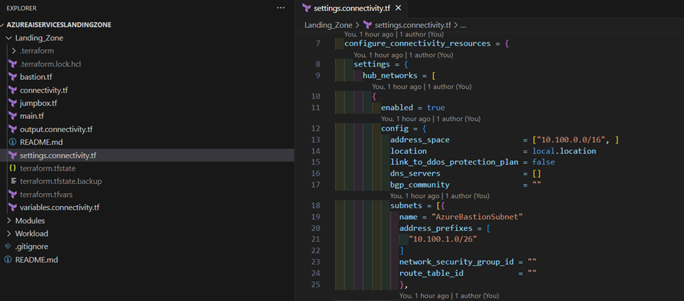 In the /Landing_Zones/ folder, create a file named terraform.tfvars and set the connectivity_subscription variable to your connectivity subscription ID.