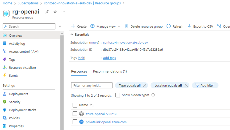 To connect to the private endpoint, we need to resolve the hostname of Azure Open AI using a private DNS zone. While the Cloud Adoption Framework recommends deploying this private DNS zone in the connectivity subscription, we've chosen to simplify our code by deploying it alongside Azure Open AI.