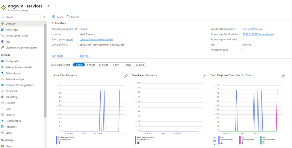 • SSL/TLS at App Gateway: Enabling SSL/TLS certificates at the Azure Application Gateway level will enhance data encryption and security, ensuring that communication between clients and web applications/AI services is protected.