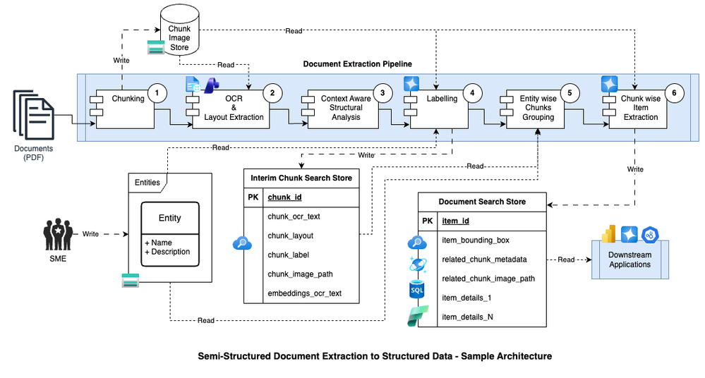 Let’s take a possible approach to demonstrate the feasibility of the following architecture, building on the motivation outlined above. The solution divides a large, semi-structured document into manageable chunks, making it easier to maintain context and references across pages. First, the document is split into logical sections. Then, OCR and layout extraction capture both text and structure, followed by structure analysis to preserve semantic relationships. Annotated chunks are labeled and grouped by entity, enabling precise extraction of items such as key-value pairs or table data. As a result, the system efficiently transforms complex documents into structured, context-rich outputs ready for downstream analytics and automation.