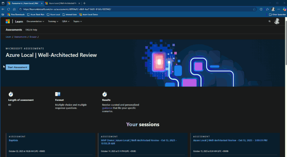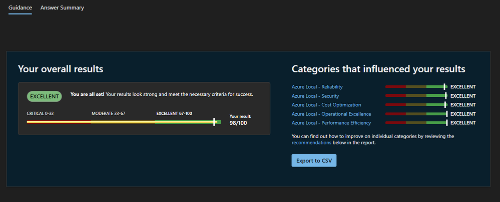 We are excited to announce the launch of the Azure Local | Well-Architected Review Assessment. If you're using Azure Local to deploy and operate business-critical workloads, you can use the assessment to answer a list of comprehensive Yes / No questions that align to the five pillars of the Well-Architected framework. Upon completing the assessment questions, you'll receive a risk or maturity score, along with detailed guidance and resource links to help you strengthen your architecture and boost your maturity or risk score.