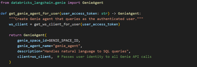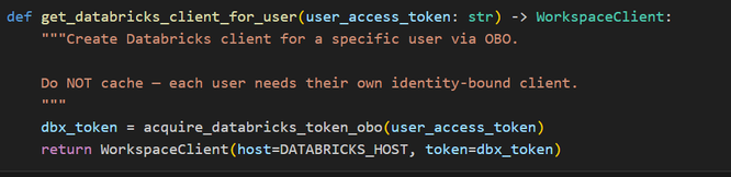 The key integration point is passing the OBO-acquired token to the Databricks SDK’s WorkspaceClient as indicated in the above screenshot, which the Genie agent uses internally for all API calls as shown in the following image.
