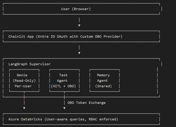 In this post, I’ll walk through how we solved this challenge for a current enterprise customer by implementing Microsoft Entra ID On-Behalf-Of (OBO) secure flow in a custom multi-agent LangGraph solution, enabling our Databricks Genie agent to query data and the data agent designed to modify or update delta tables, to do so as the authenticated user, while preserving all RBAC policies.