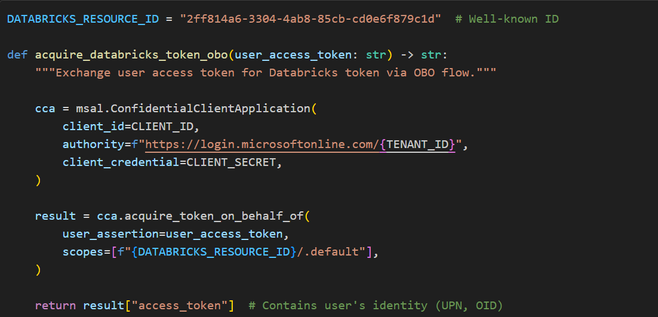 Once we have the user’s access token (with correct audience), we exchange it for a Databricks-scoped token using MSAL.